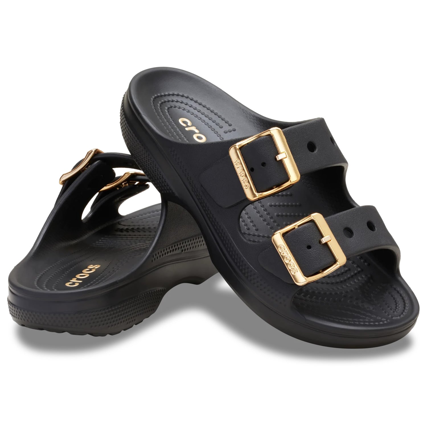 Two adjustable straps provide a secure, customizable fit and versatile styling, while a metallic buckle detail adds a polished, elevated touch. Jibbitz™ holes allow for personalized styling, offering a subtle way to express individual taste.